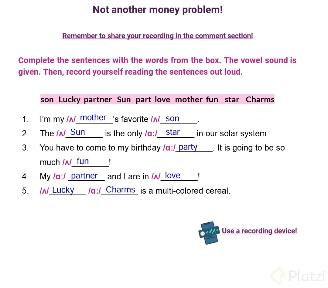 Un ejercicio útil es pronunciar frases que contengan ambos tipos de sonidos para identificar sus matices. Intenta con la siguiente oración: Not another money problem. En esta frase: