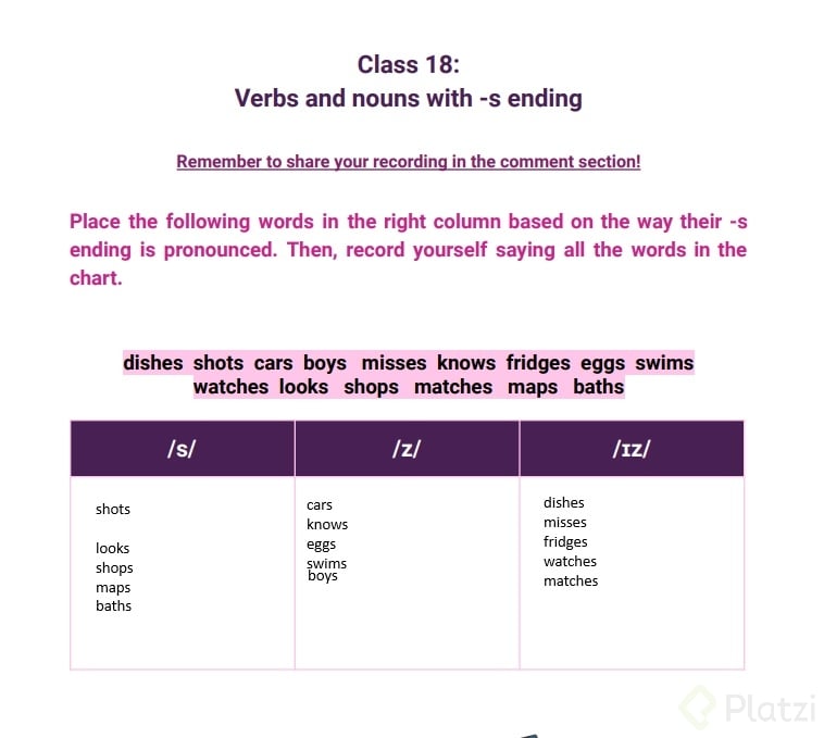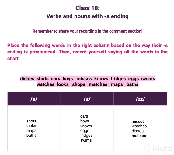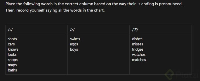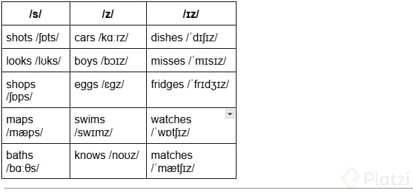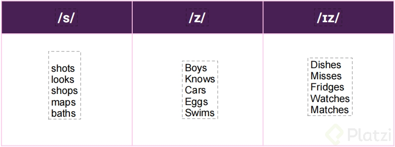 Cuando una palabra termina en /s/, /z/, /ʃ/, /tʃ/ o /dʒ/, ¡es hora de añadir un /ɪz/! Estas son las reglas para identificar cuándo utilizar esta terminación: