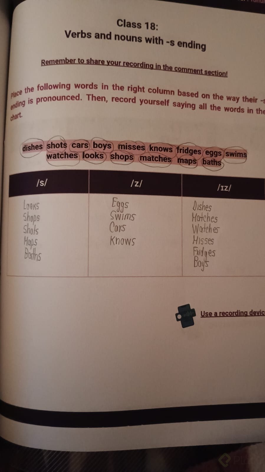 Divide las siguientes palabras en su columna correcta y graba tu progreso: dishes, shots, cars, boys, misses, knows, fridges, eggs, swims, watches, looks, shops, matches, maps, baths.