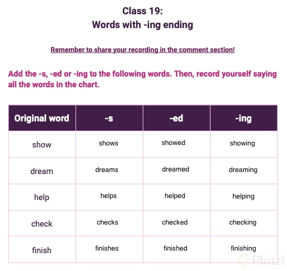 - Practica con grabaciones: Intenta añadir -ing y -ed a palabras como show, dream, help, y check.