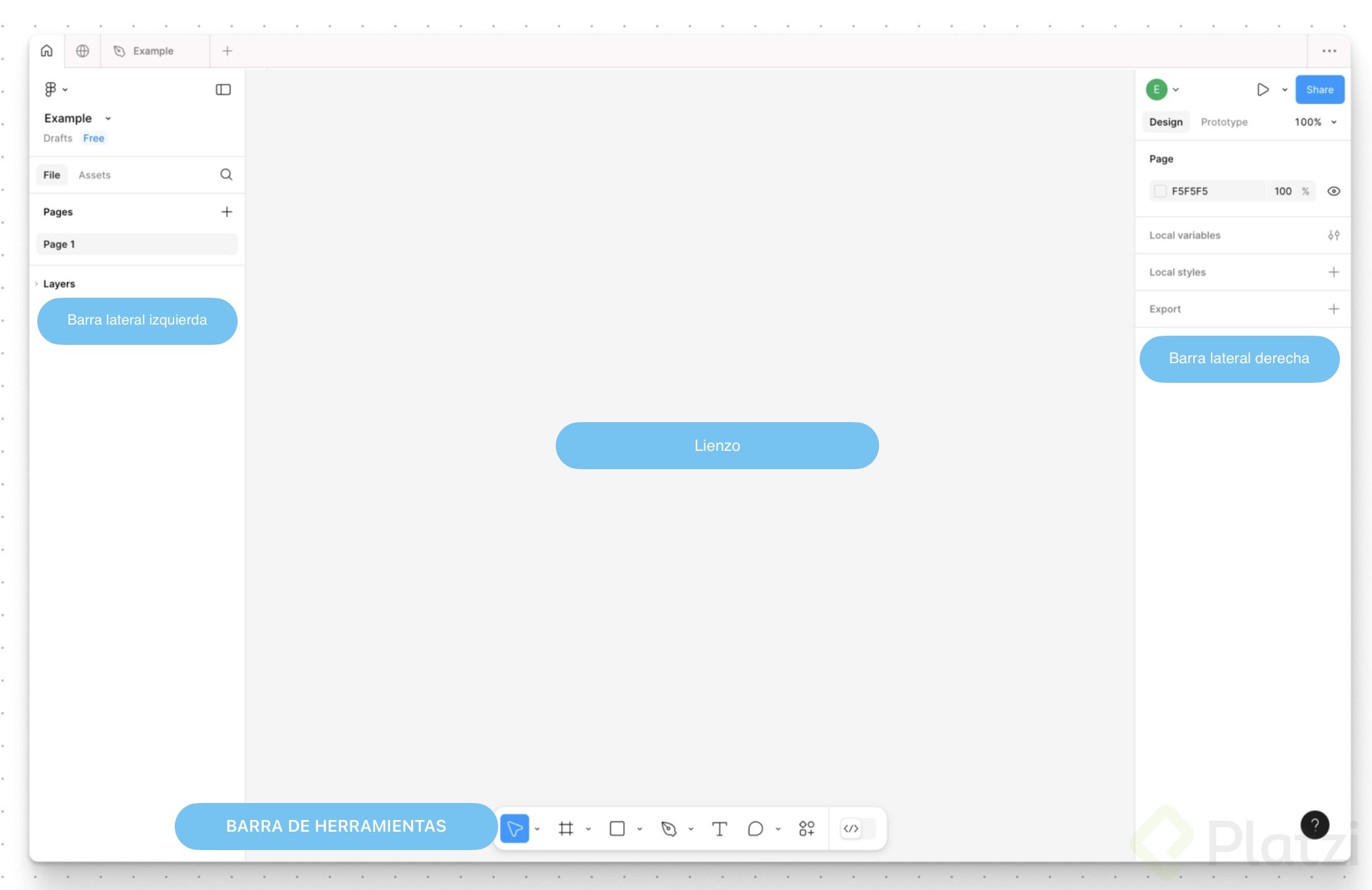 - Barra de herramientas: Herramientas clave para el diseño, como dibujos vectoriales y textos, así como acciones de compartir y previsualizar.