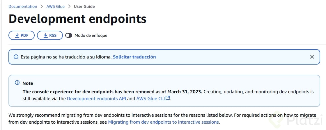 - Puede especificar librerías de Python y JAR necesarias para el developer endpoint, cargándolas desde S3.