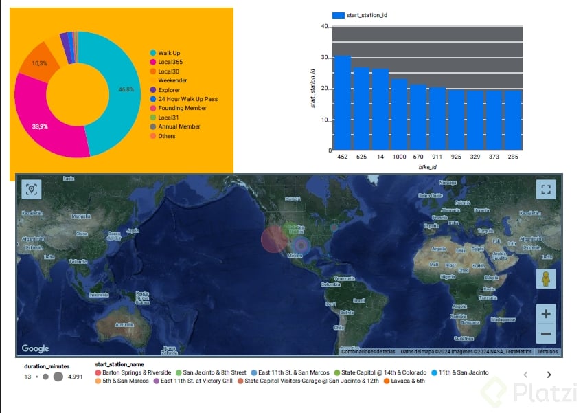 - Usa "Nombre de la estación" y "Minutos de duración" como dimensiones para resaltar las ubicaciones y las duraciones de los viajes en un formato geográfico.