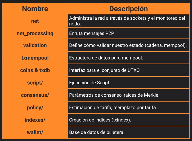 Dentro de Bitcoin Core existen múltiples secciones para responder a todos los subsistemas e interfaces para que Bitcoin y todo su protocolo pueda funcionar.