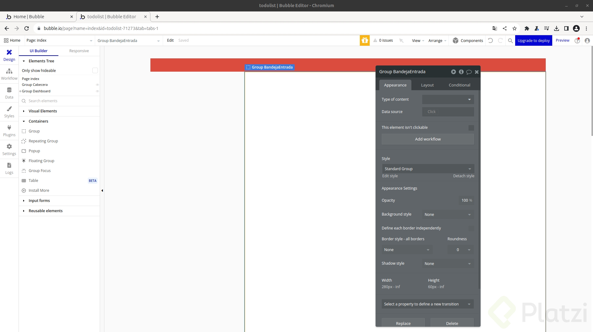 El último reto es crear las zonas de aplicación donde se visualizarán las tareas o bandeja de entrada. Al igual que antes, utiliza un grupo que funcione bajo la disposición de "columna", permitiendo que los elementos aparezcan en secuencia vertical. Desactiva el ancho fijo para permitir que el área de entrada ocupe todo el ancho disponible restante. Esta configuración asegura que cada elemento tenga su propio espacio visual destacado.