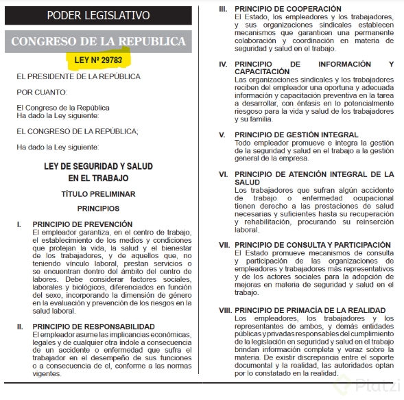 En el Perú, existe la Ley Nº 29783, Ley de seguridad y salud en el trabajo.