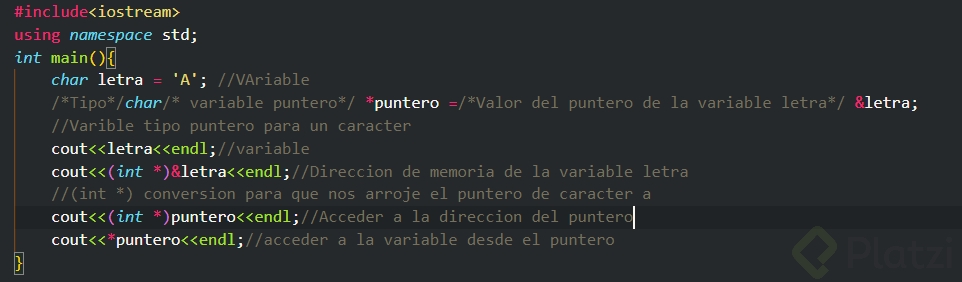 Aquí, puntero es una variable de tipo puntero que almacena la dirección de memoria de letra. El símbolo & es fundamental para obtener la dirección de una variable.