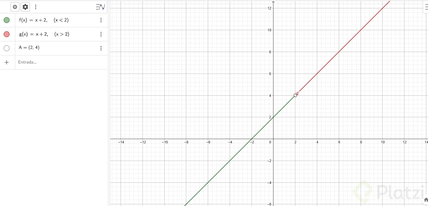 En este caso, podemos simplemente evaluar el límite y nos queda que es igual a cuatro. Esto quiere decir que a medida que nos vamos acercando a dos, la función se aproxima a cuatro. Pero recuerda, la función no está definida en dos.