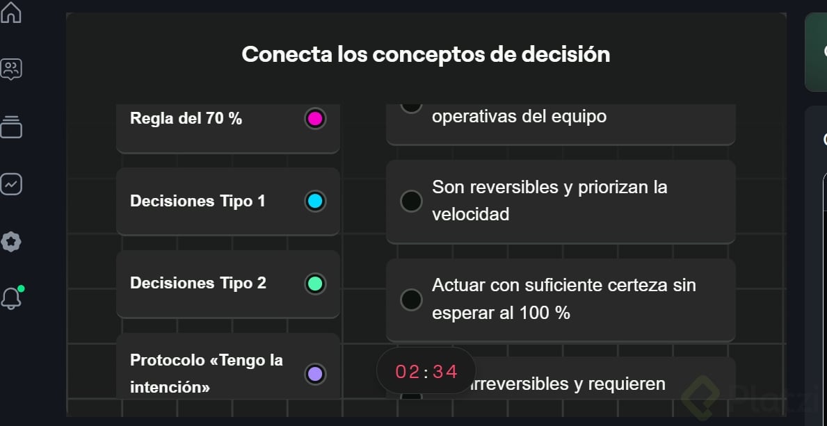 - Aplica la regla del 70 %: con suficiente información para estar razonablemente seguro, decide ya. No esperes el 100 %.