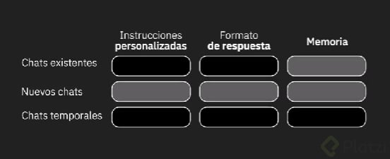 Chat Temporal: Si deseas trabajar en un chat sin contexto previo memorizado, puedes iniciar un chat temporal donde solo las instrucciones personalizadas se tendrán en cuenta, ignorando cualquier memoria establecida anteriormente.