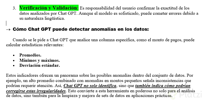 - Verificación y Validación: Es responsabilidad del usuario confirmar la exactitud de los datos analizados por ChatGPT. Aunque el modelo es sofisticado, puede cometer errores debido a su naturaleza lingüística.