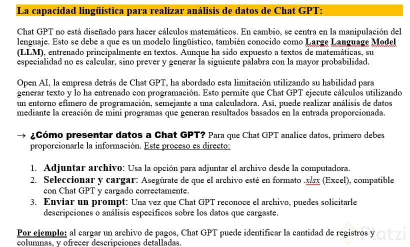 Análisis Preliminar: ChatGPT puede explorar el contenido de los archivos y ofrecer una sinopsis de los datos. Al hacerlo, entrega una vista previa del archivo e incluso resalta datos importantes antes de procesar todo.