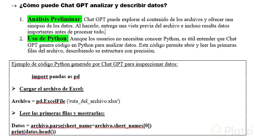 Uso de Python: Aunque los usuarios no necesitan conocer Python, es útil entender que ChatGPT genera código en Python para analizar datos. Este código permite abrir y leer las primeras filas del archivo, describiendo su estructura con precisión.