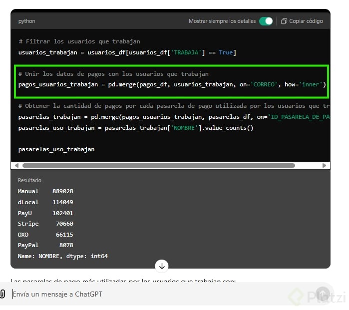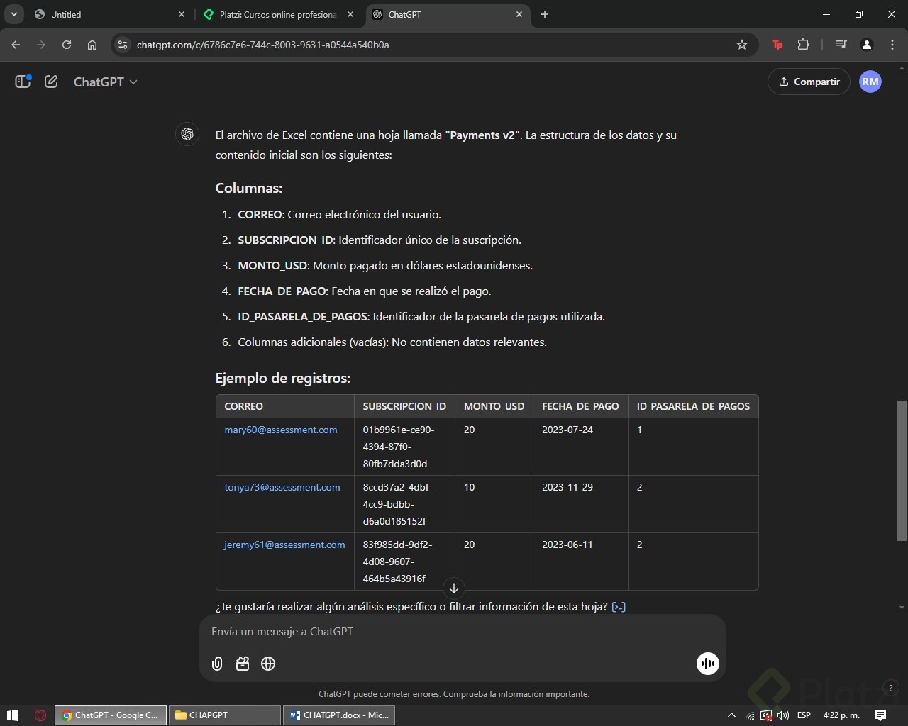 Por ejemplo, al cargar un archivo de pagos, ChatGPT puede identificar la cantidad de registros y columnas, y ofrecer descripciones detalladas.