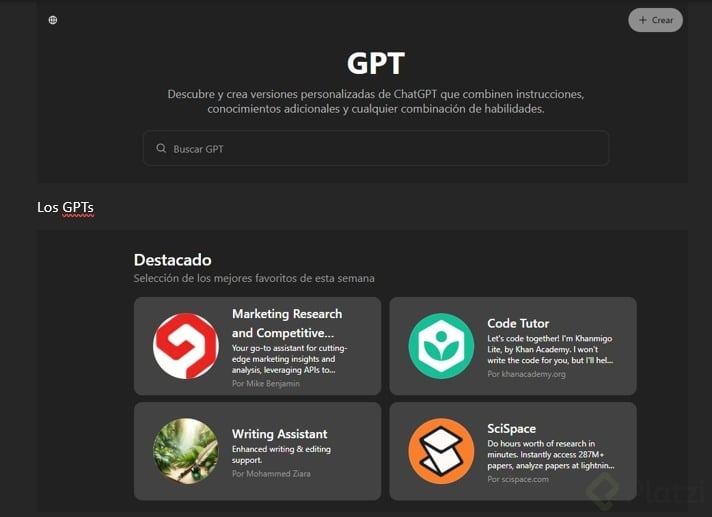 Creación de asistentes GPT personalizados: La suscripción te permite explorar y desarrollar tus propios GPTs. Accede a esta función navegando a “Explorar GPTs” y seleccionando “Create” para comenzar a personalizar.