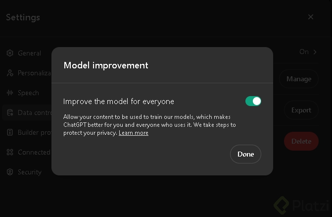 - Desactiva la opción de "mejorar el módulo para todos", si deseas que la información compartida no sea utilizada para entrenar futuros modelos. Esto protege la confidencialidad de tu información.