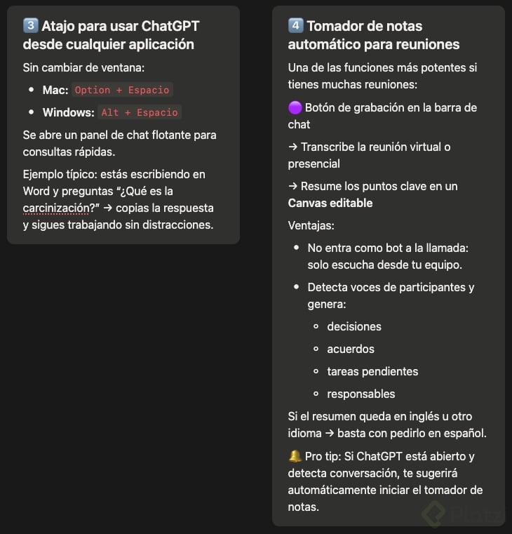 Además de las integraciones, el escritorio añade atajos para invocar el chat en cualquier momento y un tomador de notas en reuniones que transcribe y resume el audio, ya sea virtual o presencial.