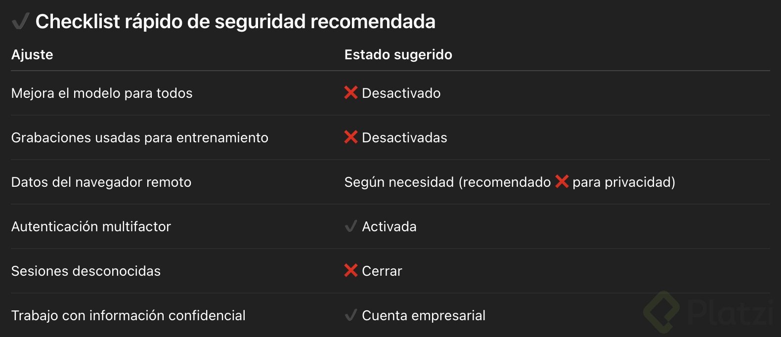 Desde Configuración > controles de datos y seguridad puedes gestionar cómo ChatGPT maneja tu información. Este es el núcleo de tu protección cotidiana.