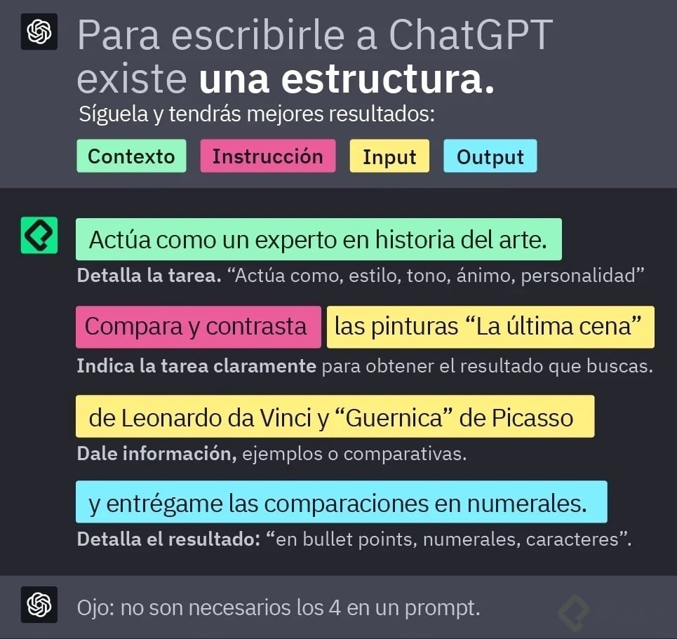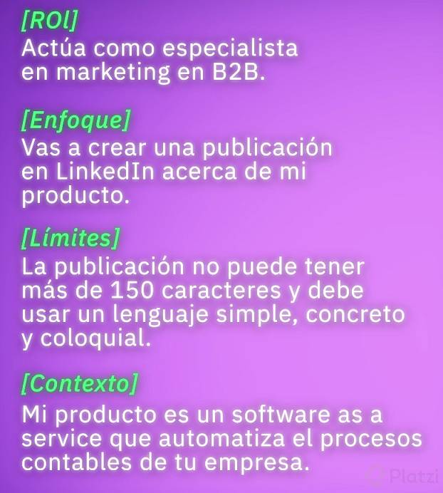- Definir rol, formato, tono y estilo aumenta precisión y utilidad.