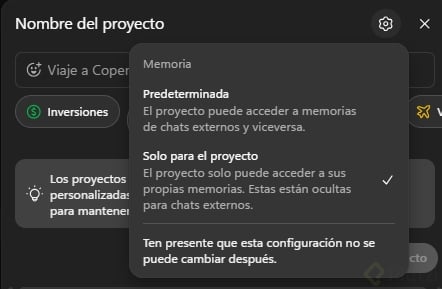- Con memoria activada, las conversaciones del proyecto se relacionan entre sí y mejoran la continuidad.
