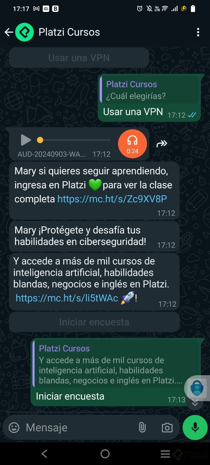 La confianza en tu seguridad digital comienza con tus elecciones diarias. Así que pon a prueba la seguridad de tus datos a través de una experiencia interactiva de Platzi 💚 en WhatsApp.