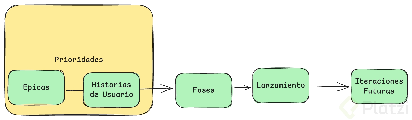 Fases: Indican los distintos momentos en el desarrollo, como el MVP (Minimum Viable Product), lanzamiento o iteraciones futuras. Estas fases ayudan a organizar el desarrollo en etapas manejables.
