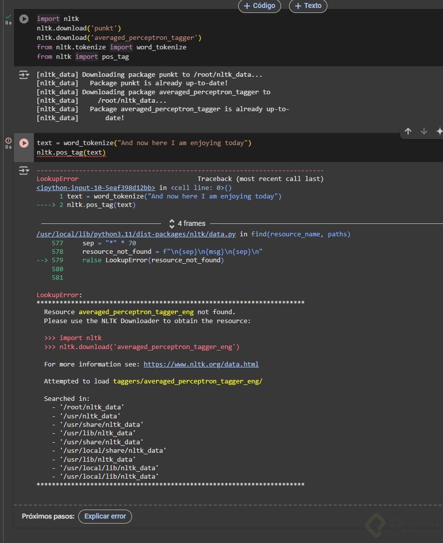 El etiquetado de palabras en español con NLTK requiere pasos adicionales ya que no existen algoritmos preentrenados para este idioma. Estos son algunos pasos que debemos seguir: