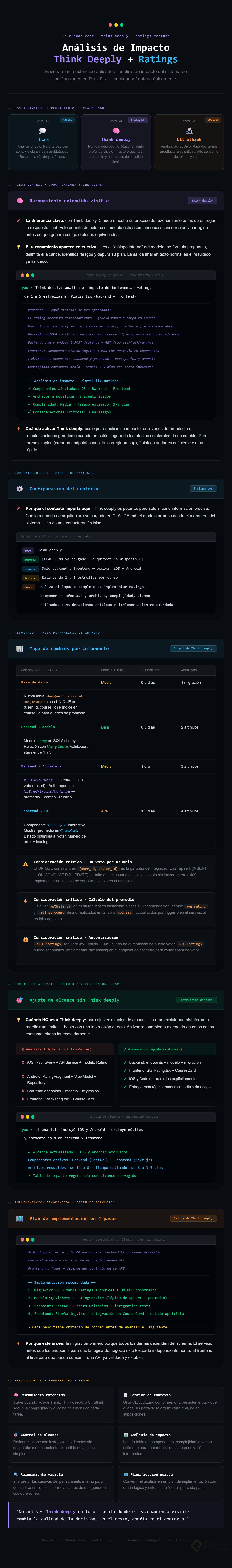 Implementar un sistema de ratings eficaz exige claridad desde el inicio. Aquí verás cómo usar pensamiento extendido en Claude Code para obtener un análisis de impacto enfocado en backend y frontend de Platiflix, tomando en cuenta el rango de 1 a 5 estrellas, la arquitectura del sistema y el alcance del feature sin móviles.
