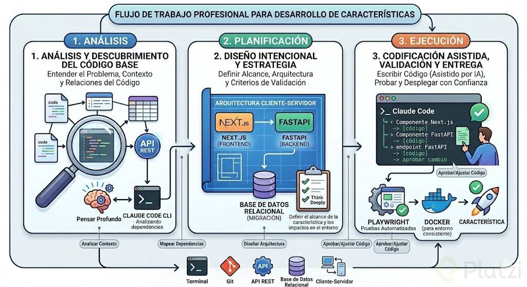 Domina un flujo profesional para construir features con claridad y control. Aquí encontrarás un resumen directo y aplicable: es un curso técnico, pensado para quien ya maneja bases como terminal, Git, API REST, bases de datos relacionales y arquitectura cliente-servidor. Con FastAPI, Next.js, Docker, Playwright y Claude Code verás cómo escribir menos código y pensar mejor para mantener la arquitectura y la eficiencia.