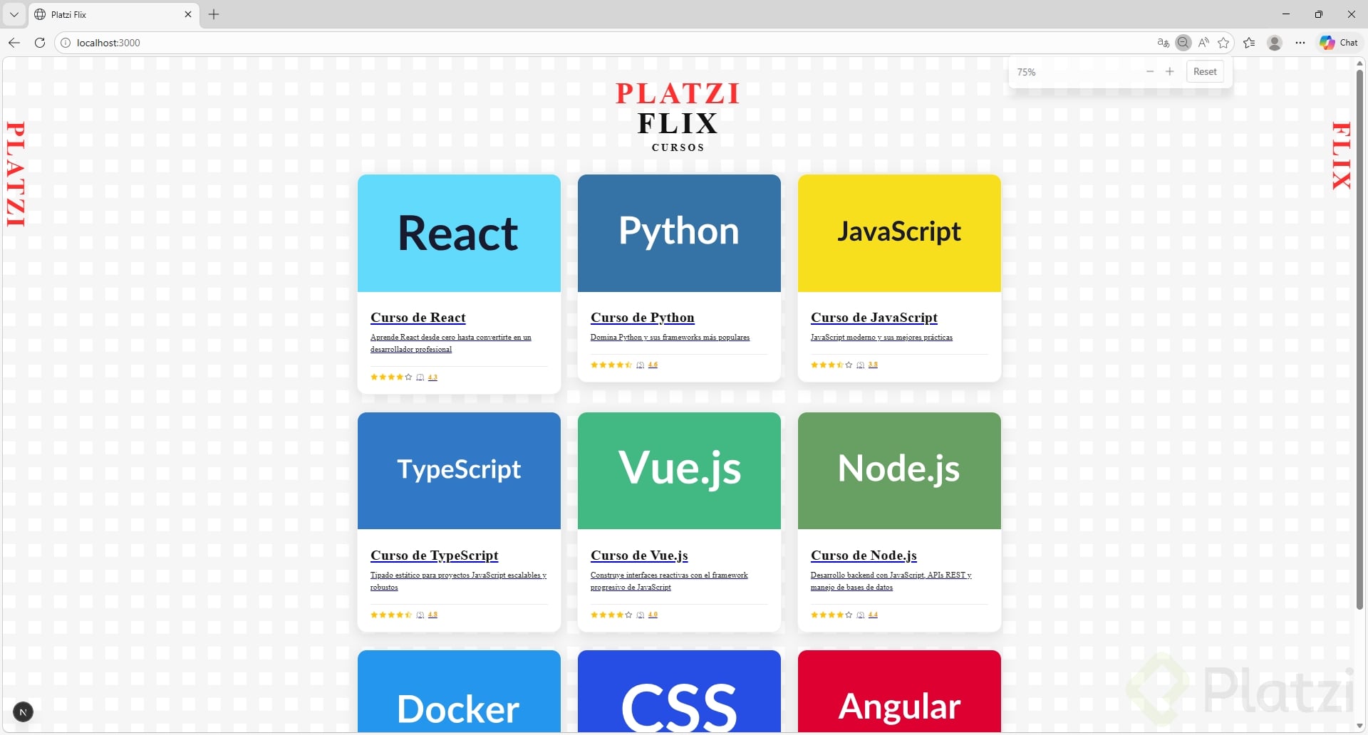 Tras ejecutar el plan, el navegador ya muestra datos reales del API. Para el curso de React se observó total ratings 4 con promedio 4.25; luego se visualizó 4.5 con cantidad 4. Para el curso de Python se vio cantidad 2. Esto confirma que el frontend consume correctamente el backend.