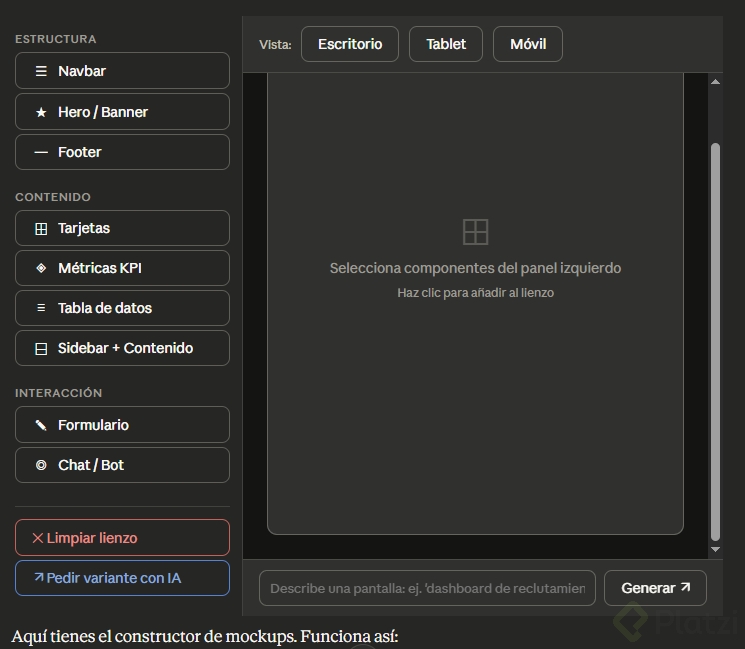 he creado un artefacto enfocado en la generación de mockups y que me los entregue en HTLM