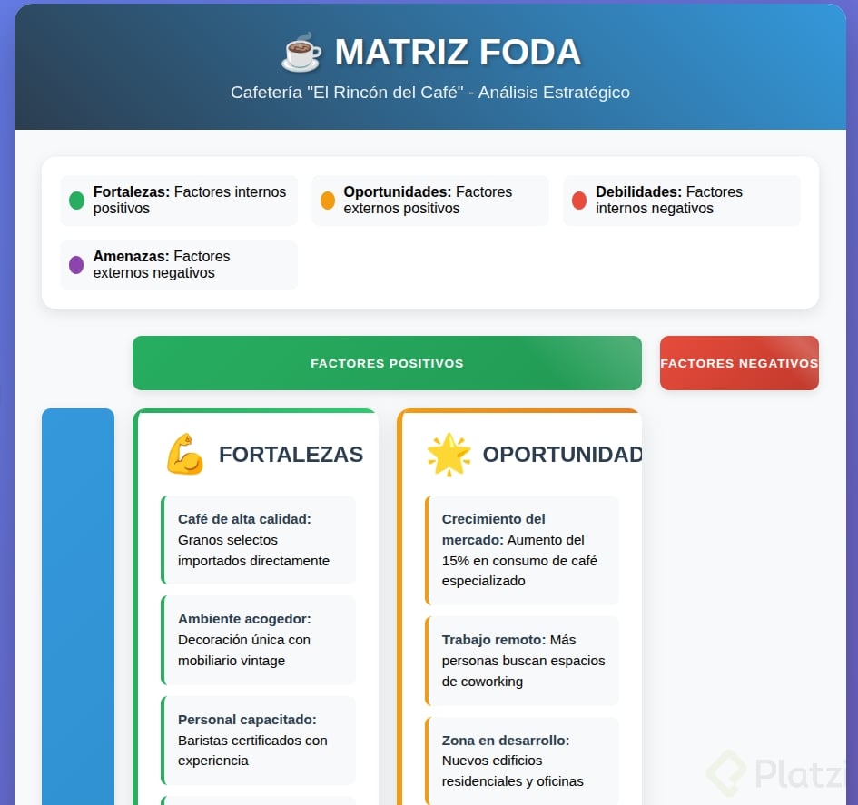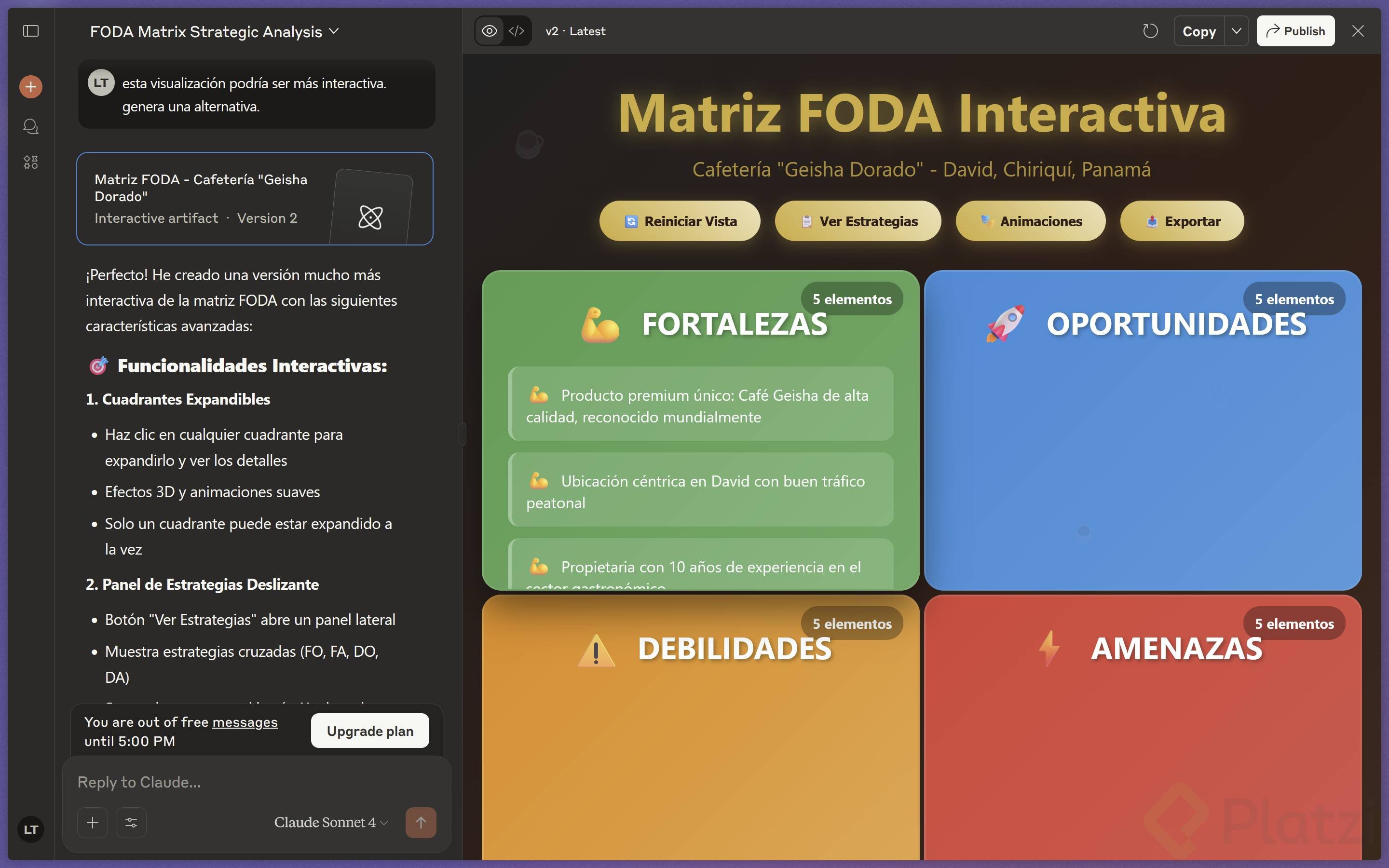 Por ejemplo, puedes pedirle a Claude que genere y visualice una matriz FODA (fortalezas, oportunidades, debilidades, y amenazas), lo cual se puede ajustar y mejorar iterativamente.