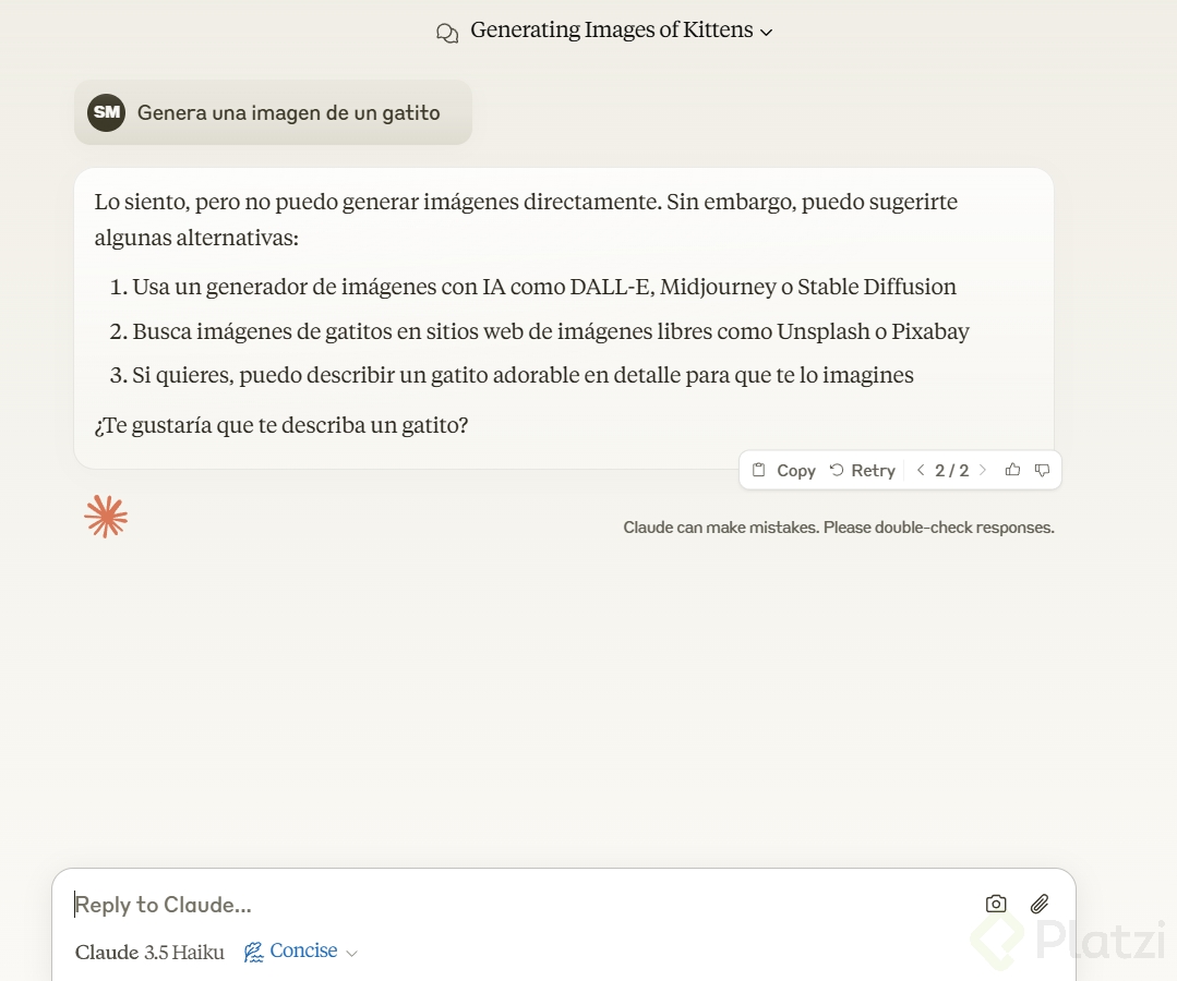 ChatGPT destaca en su capacidad para generar imágenes, aunque se mantiene con un modelo más antiguo comparado con las nuevas tecnologías de generación de imágenes. Por otro lado, Claude se diferencia al generar código que puede crear representaciones visuales simples. Esta es una solución ingeniosa cuando la generación directa de imágenes no es posible.