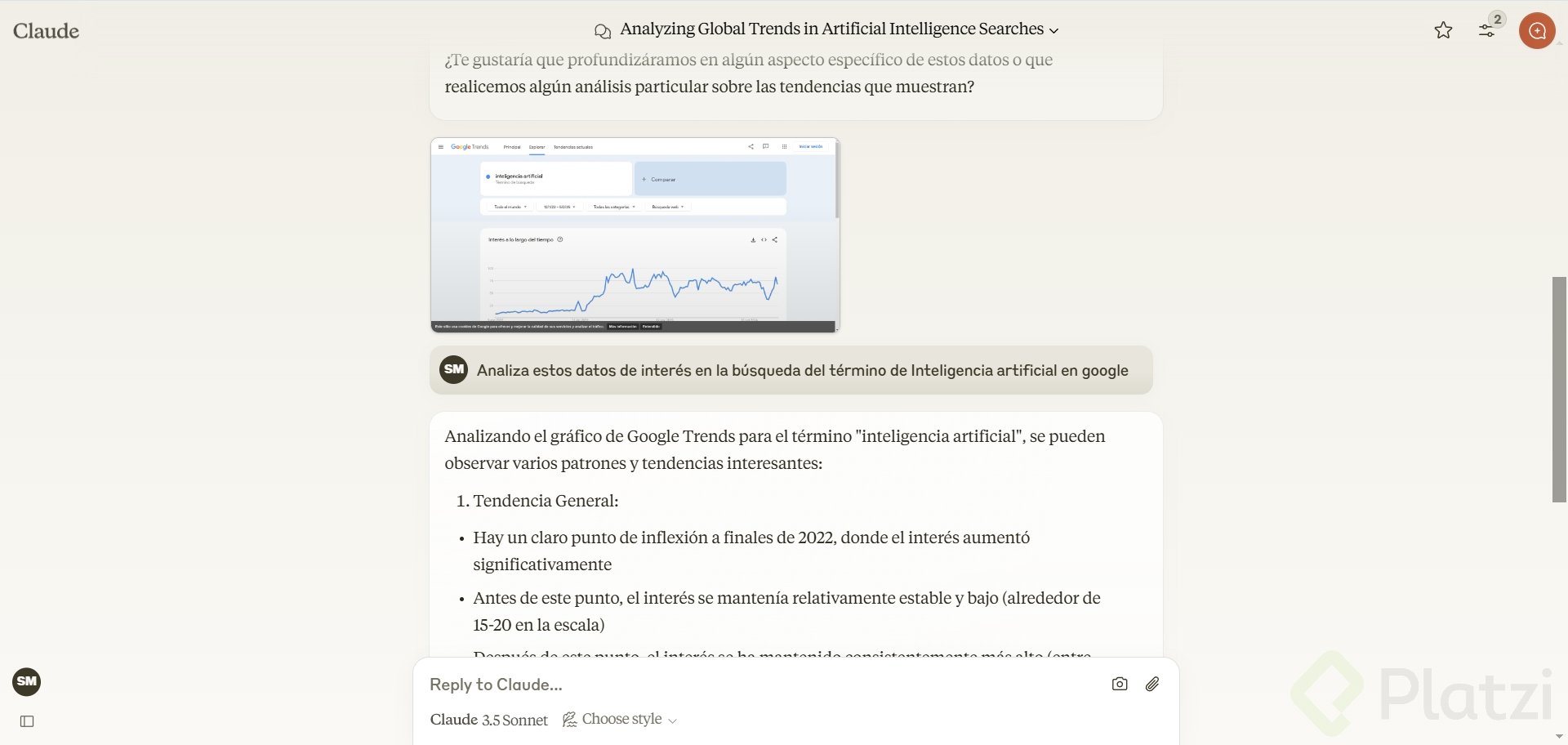 Las nuevas capacidades de las IAs permiten conectar mejor con diferentes fuentes de datos. Desde capturar pantallazos que contienen datos críticos, hasta subir estos datos directamente, las posibilidades van en aumento. Por ejemplo, utilizando Google Trends para analizar la popularidad de términos de búsqueda, podemos obtener insights valiosos sobre el comportamiento de ciertos temas en el tiempo. Descarga los datos, súbelos y deja que la IA te ayude a analizarlos.