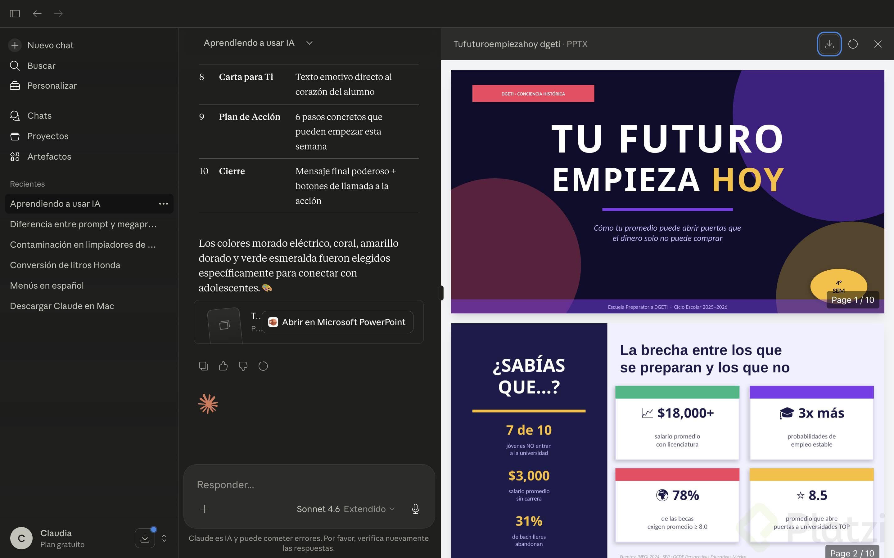 Cuando Claude termina de generar la presentación, te ofrece dos caminos: puedes descargarla directamente como un archivo .pptx (para abrirlo en PowerPoint) o enviarla a tu Google Drive para editarla como una Presentación de Google.