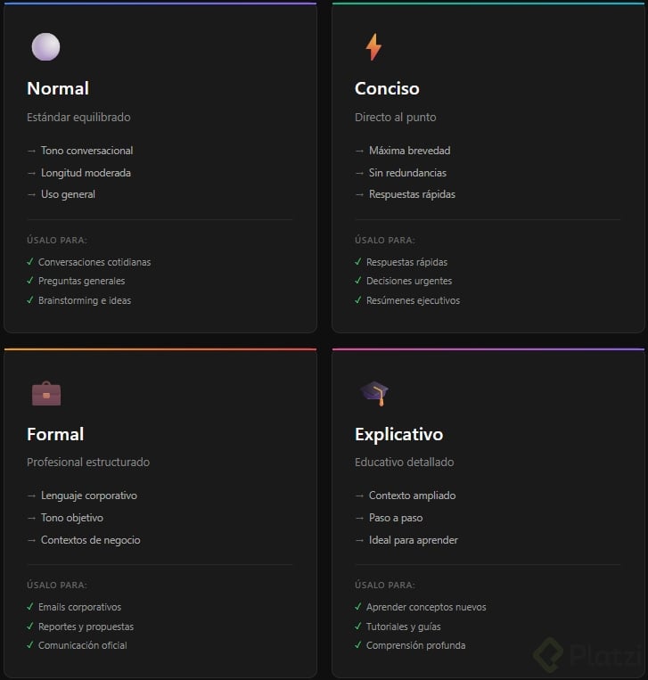 - Conciso: máximo foco en brevedad; frases directas y párrafos cortos.