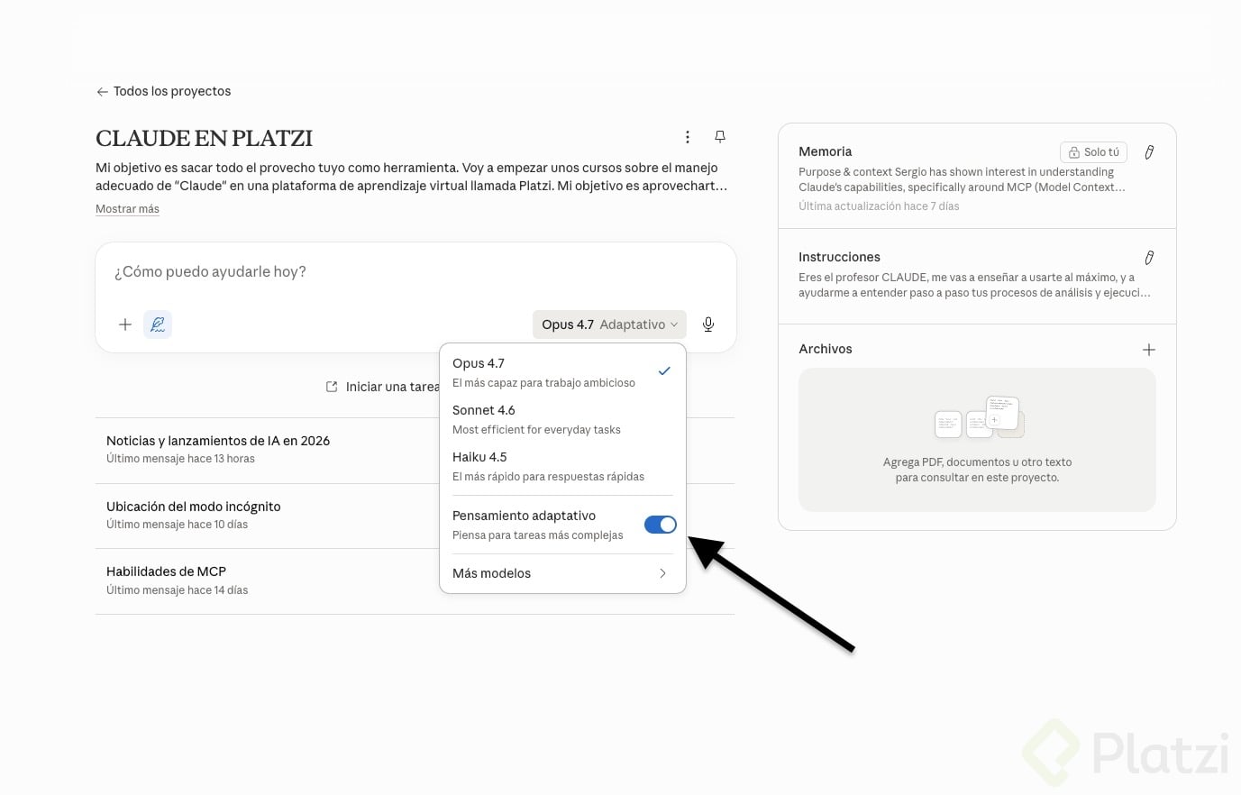 Selecciona el modelo en Claude y activa el pensamiento extendido con el ícono de reloj. Si buscas una respuesta rápida y liviana, usa haiku con pensamiento extendido. Para tareas complejas, la recomendación es Opus 4.5 con pensamiento extendido, aprovechando al máximo sus capacidades.