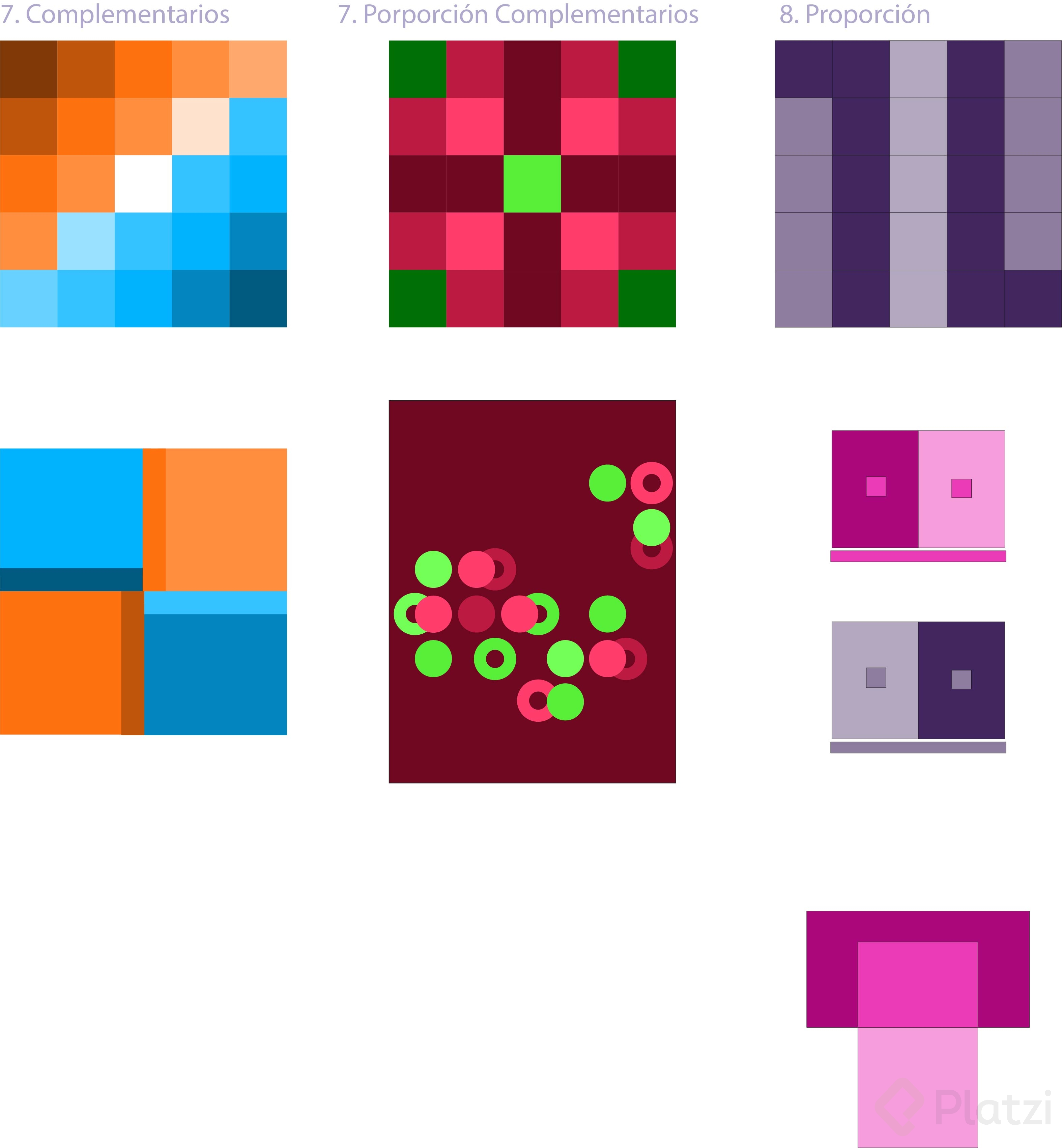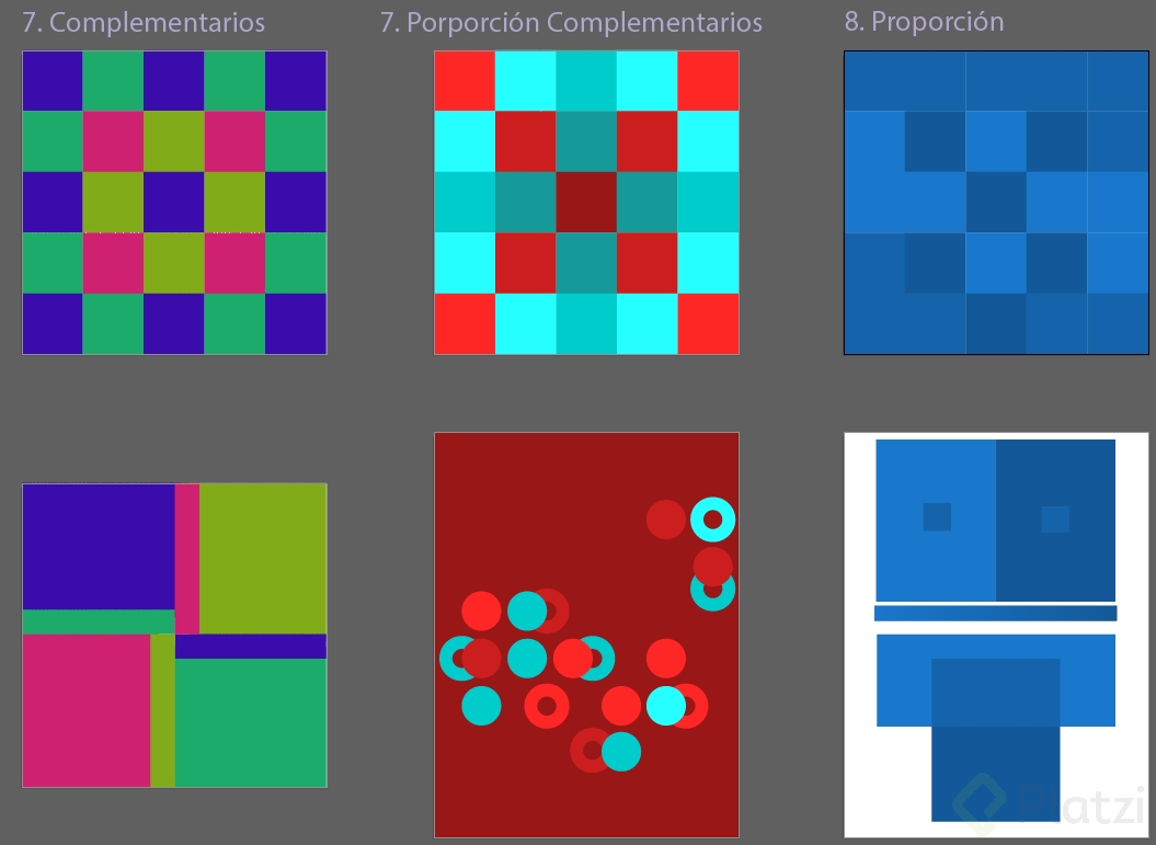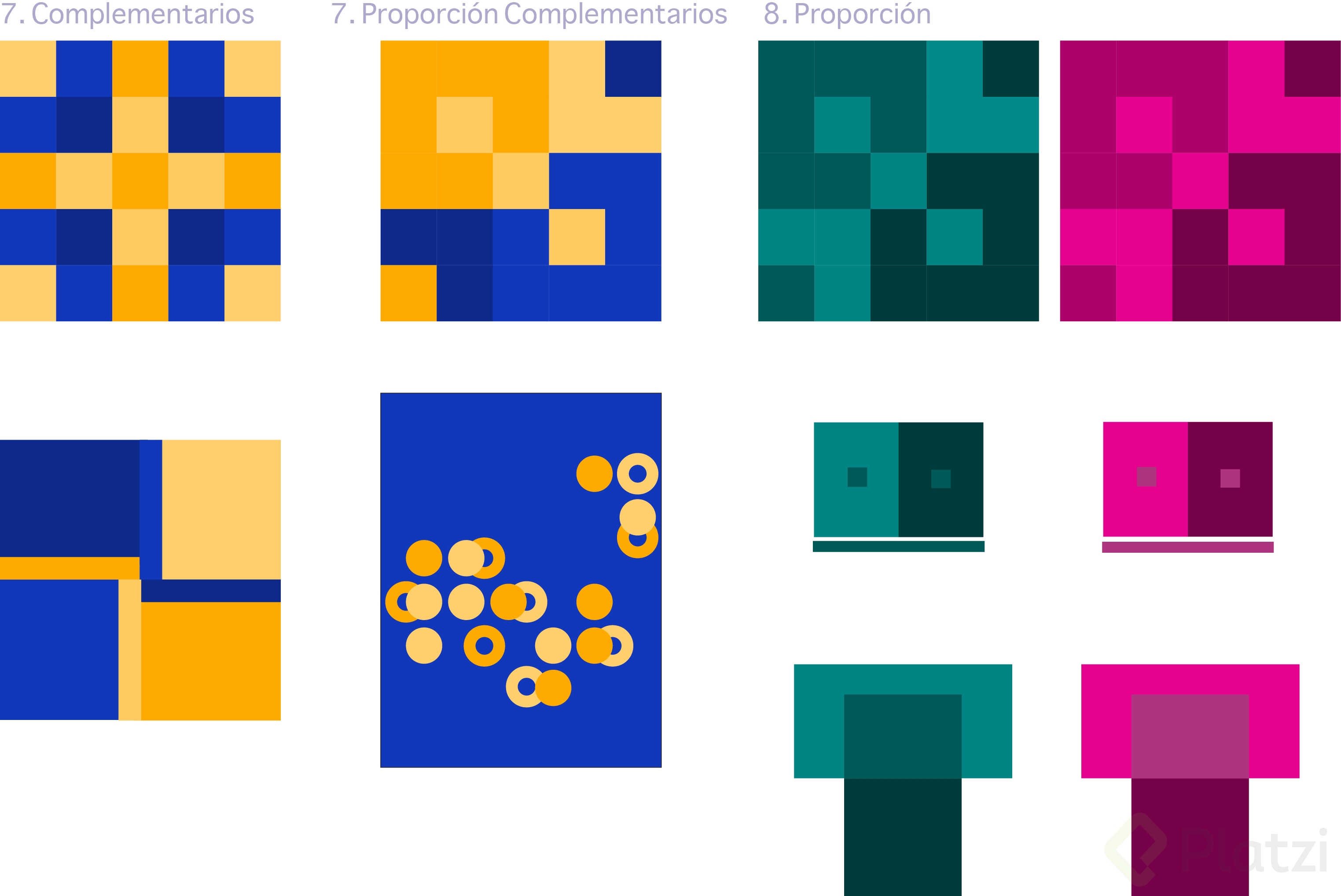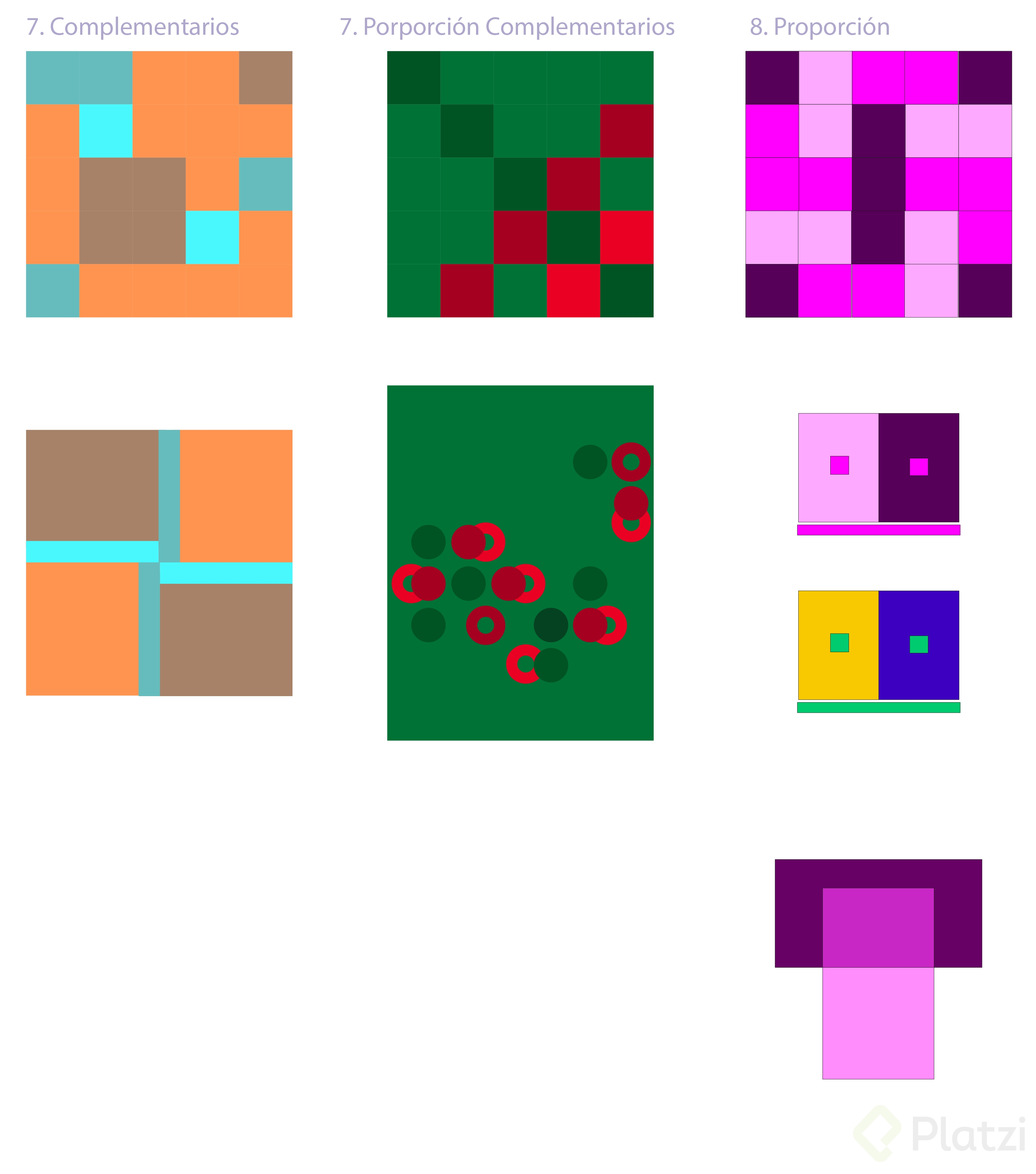 - Colores complementarios: Usar rojos y verdes juntos puede ser desafiante debido a la fuerte respuesta del ojo. Sin embargo, jugar con sus proporciones puede mitigarlo.