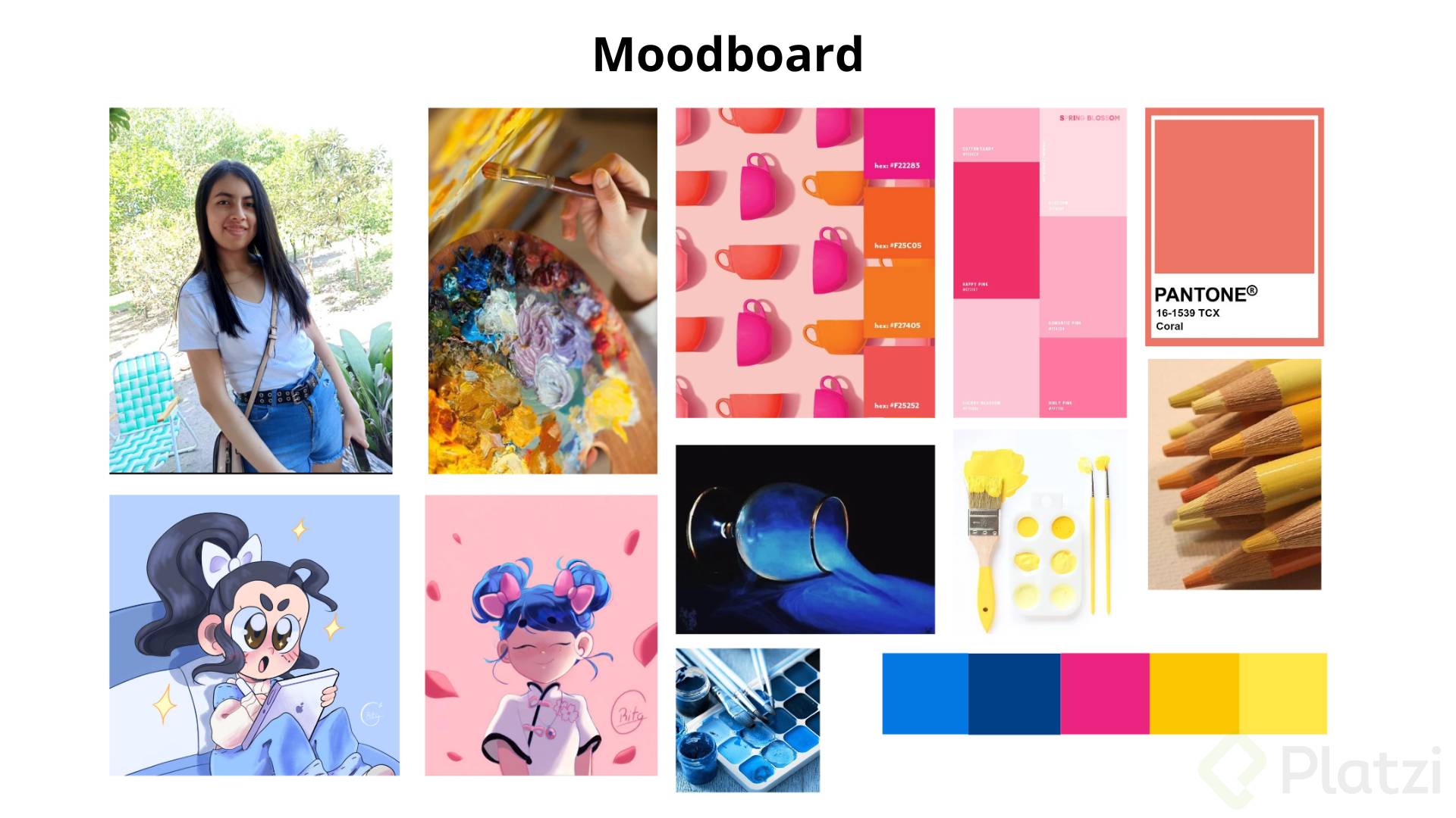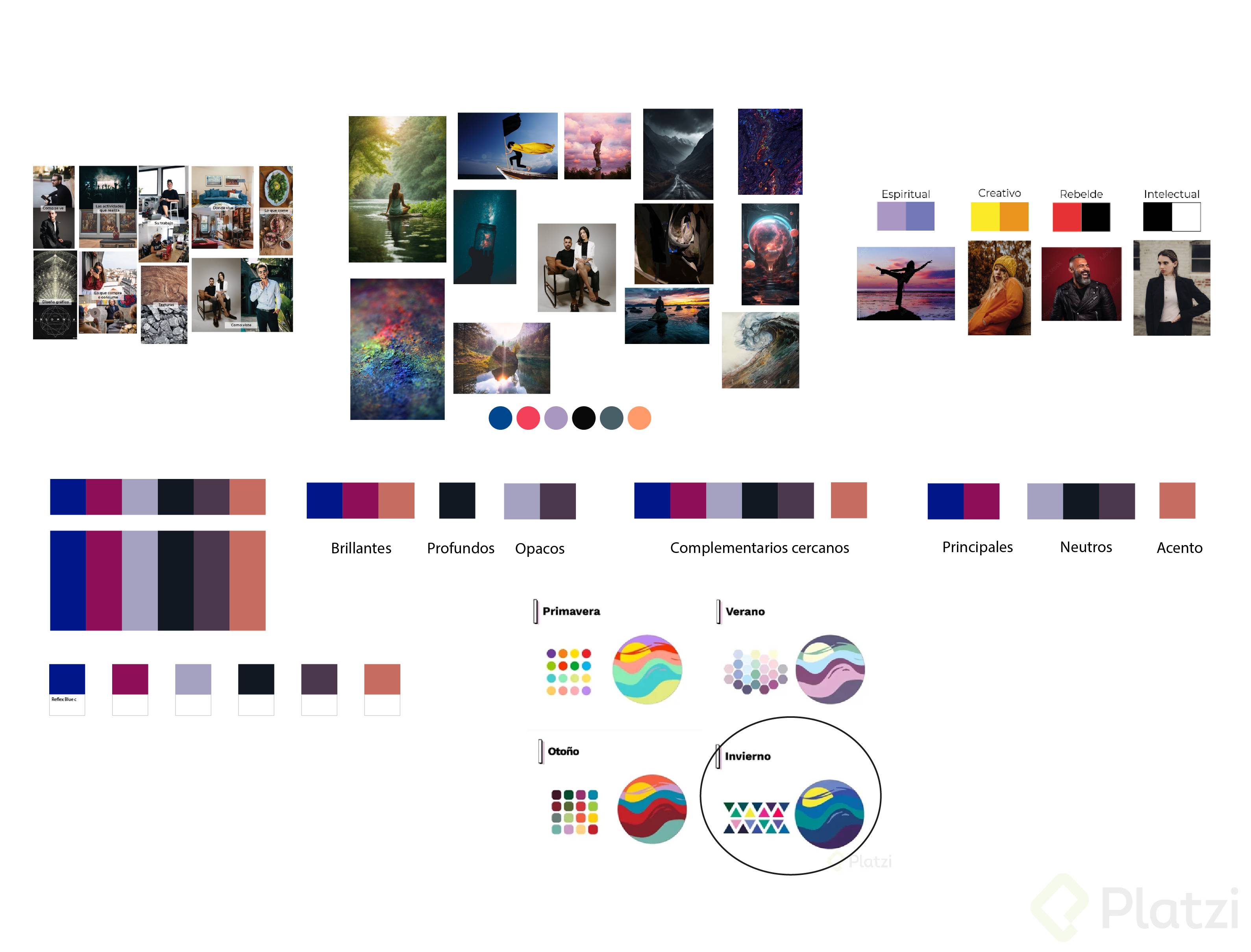 Esta etapa se centra en explorar y experimentar. Observa todos los elementos visuales de tu marca y, sin poner filtros ni restricciones, selecciona los colores que sientes podrían resonar con la esencia de lo que estás diseñando. La inspiración puede provenir de cualquier elemento capturado en tus herramientas de investigación.