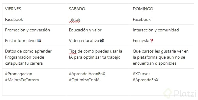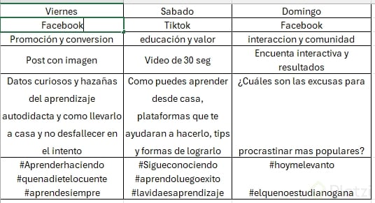 - Martes: Video en TikTok interactuando con la comunidad, solicitando opinión sobre habilidades o cursos deseados.