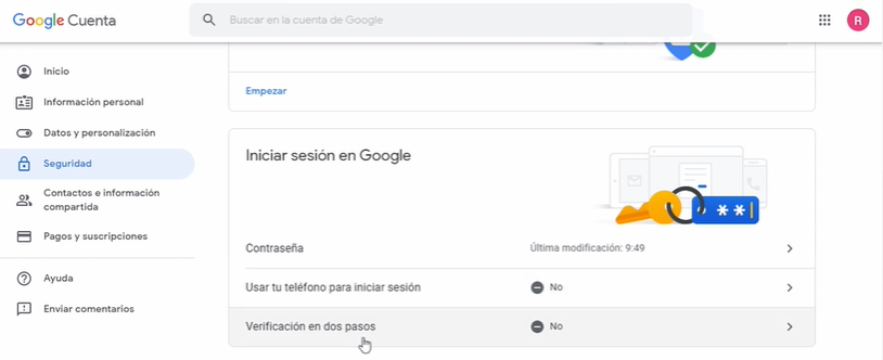Selecciona la opción “Seguridad”, y luego dirígete a “Iniciar sesión en Google”.