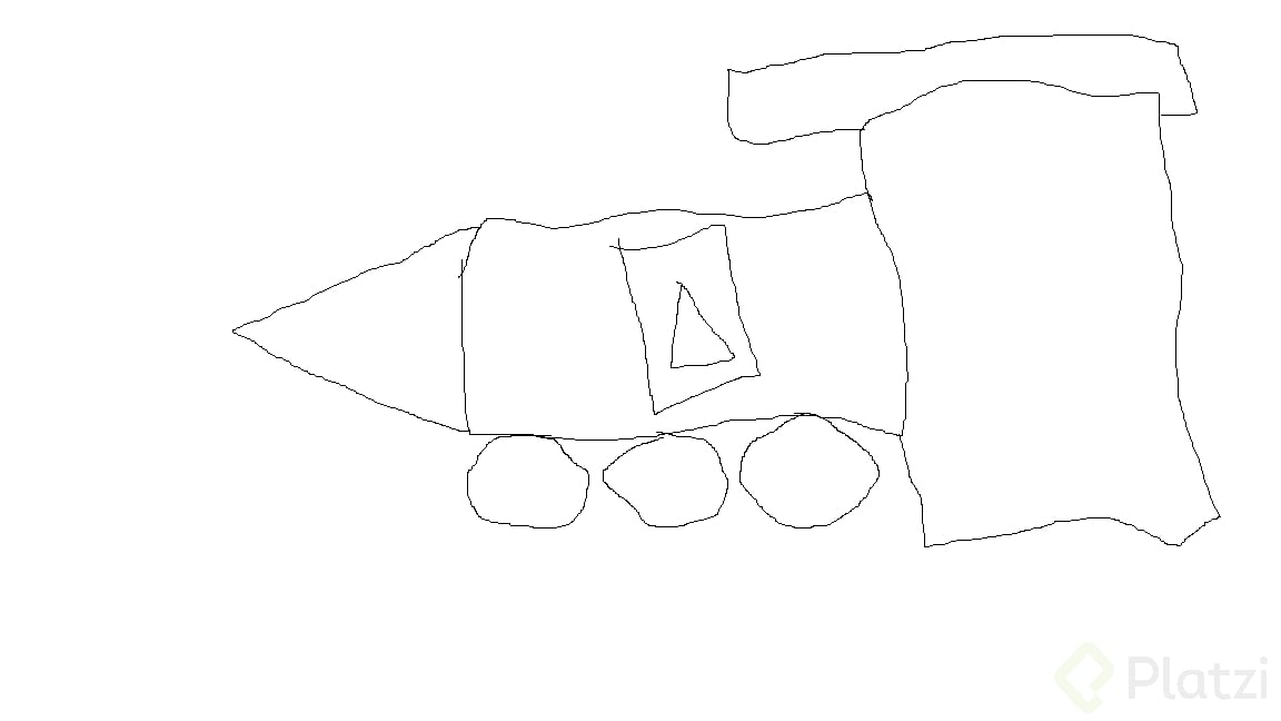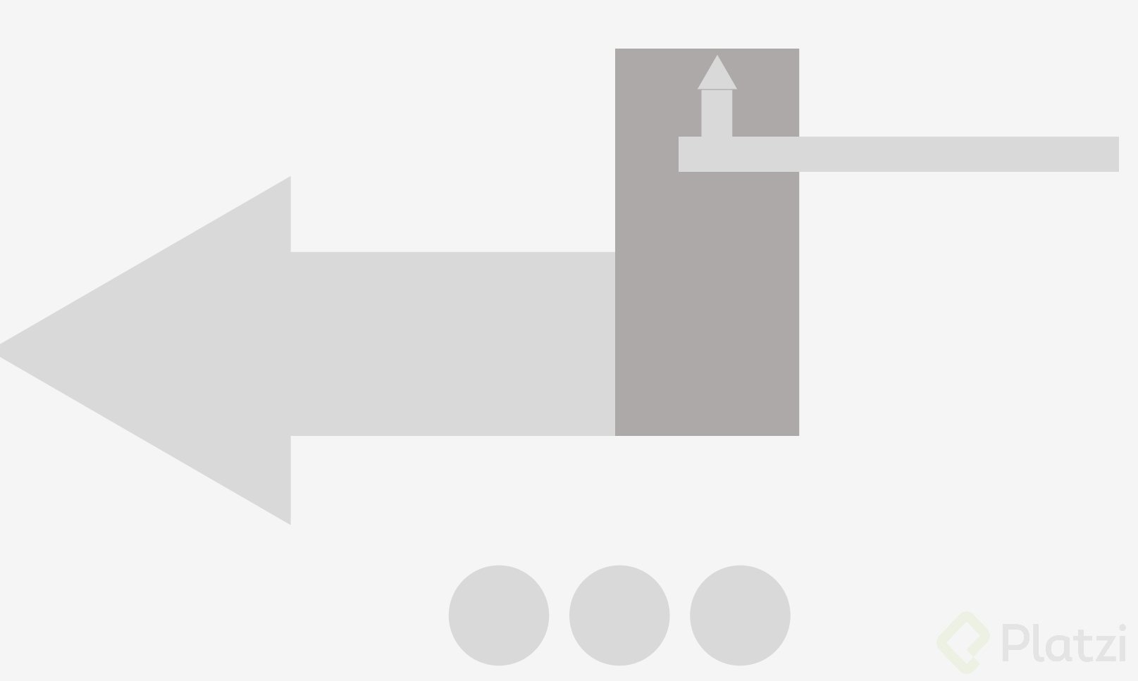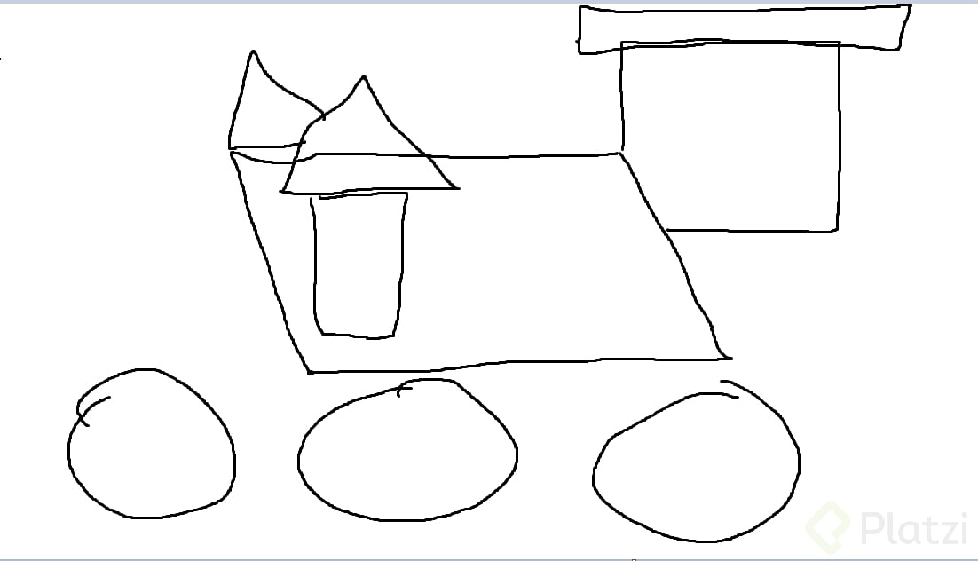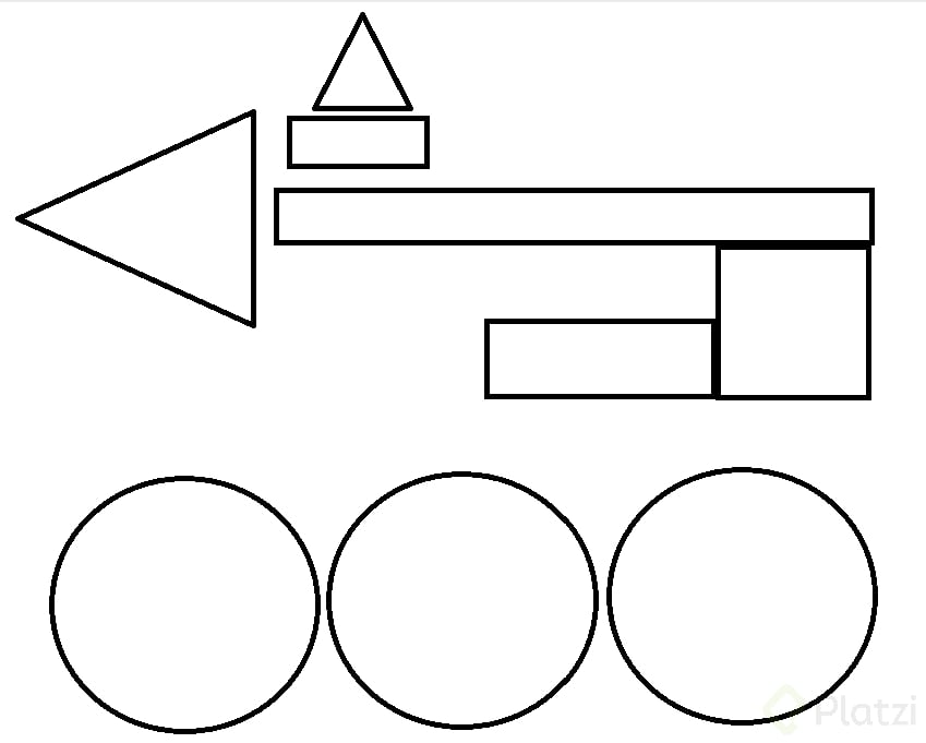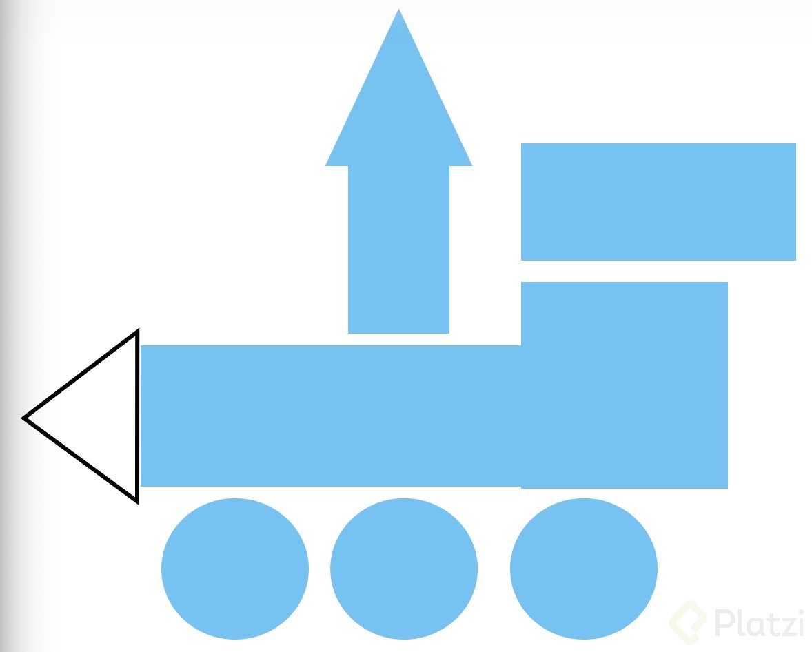 - A la izquierda del rectángulo horizontal dibuja un triángulo grande con su punta hacia arriba.