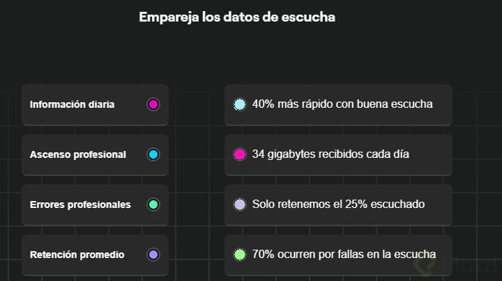 Cada día recibimos alrededor de 34 gigabytes de información, casi 100.000 palabras, pero solo retenemos cerca del 25% de lo que escuchamos. En comunicación profesional, el 70% de los errores proviene de fallas de escucha y no de expresión, y quienes dominan esta habilidad son promovidos hasta 40% más rápido. La escucha activa es hoy un diferenciador decisivo: mejora la comprensión, eleva la empatía y reduce conflictos.