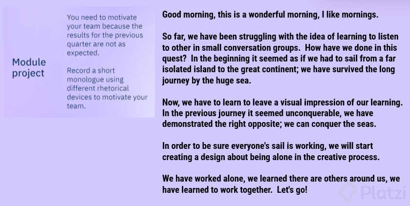 Para tu proyecto, graba un breve monólogo que incluya estos dispositivos retóricos. Puedes también apoyarte en herramientas de inteligencia artificial para enriquecer tu discurso y hacerlo más dinámico. Reflexiona sobre cómo cada elemento de retórica contribuye a dar fuerza a tu mensaje y comparte en los comentarios qué tan efectivo piensas que sería en tu situación específica.
