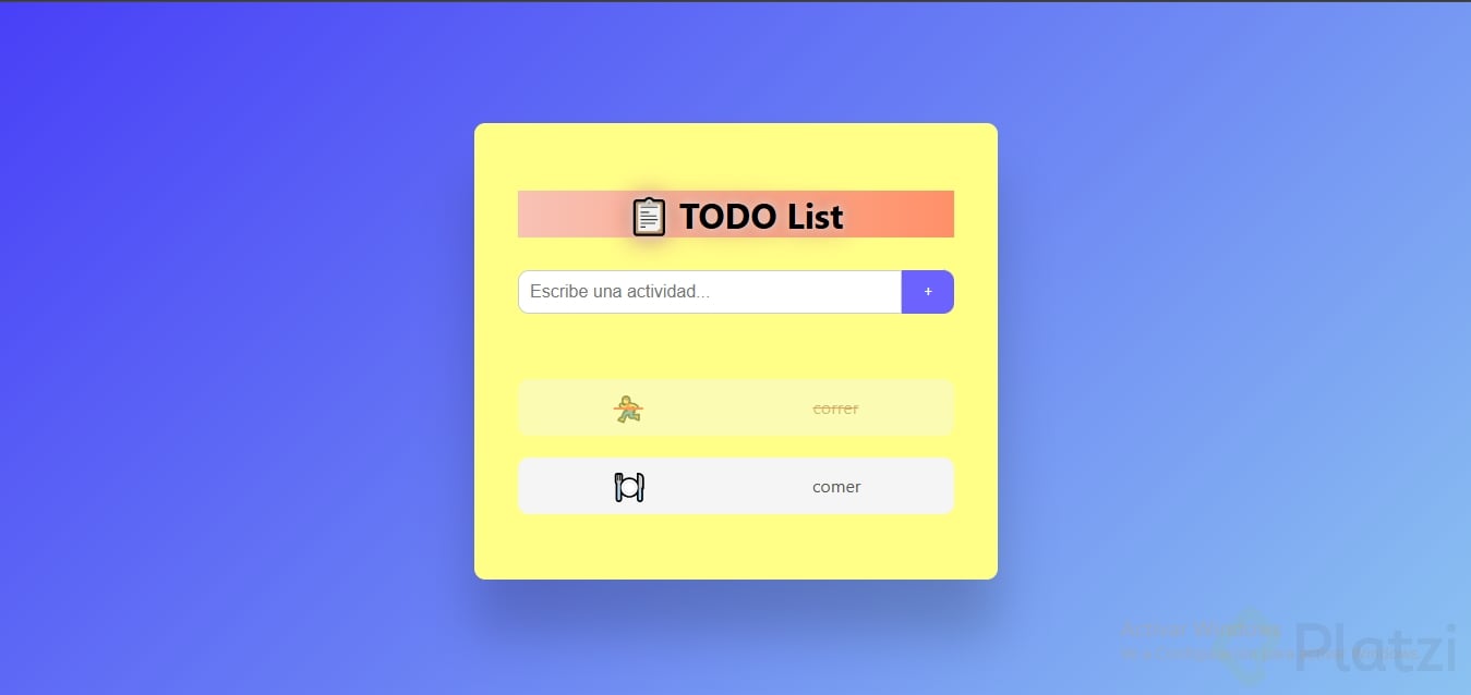 Adicionalmente, otra de las funciones de este TODO es que al darle clic al emoji (actividad), éste se debe remover de la lista. Puedes tomar este diseño como referencia: