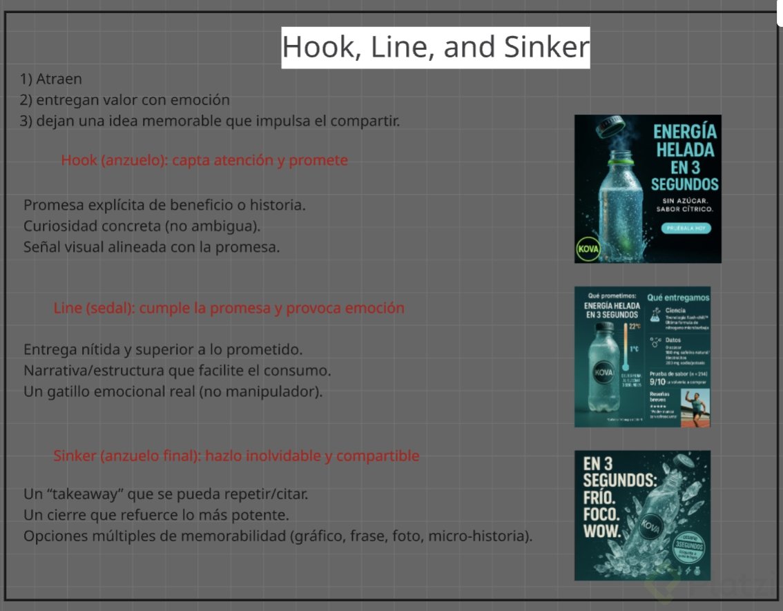 Aplicación práctica: usa esta estructura en tus formatos, crea un archivo de benchmarks y analiza: objetivo, idea, formato y hook, line, sinker de los mejores ejemplos que veas.