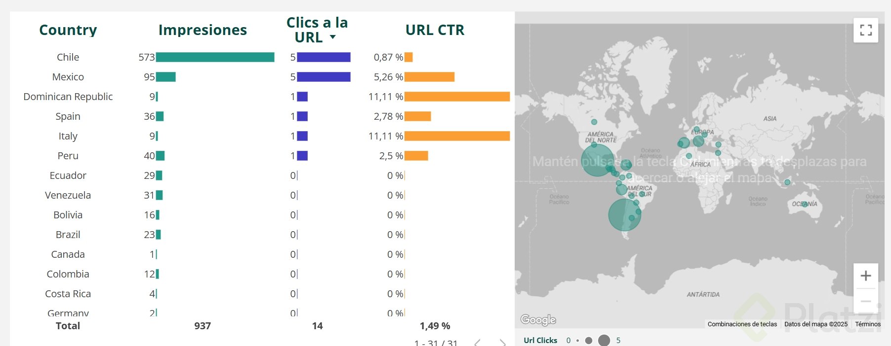 - Análisis geográfico: clics e impresiones por país (ej.: Colombia, Argentina, España, Chile, México, Perú) e interpretación visual con gráfico de burbujas.