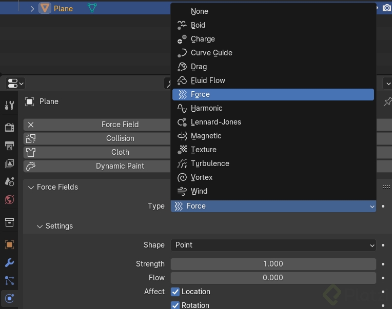 Wind, o viento, es una fuerza que funciona como un ventilador en miniatura. Manipular su posición y los parámetros de velocidad y turbulencia permite controlar la dirección y la dispersión de los objetos en tu escena. Úsalo para simular situaciones de viento o simplemente para añadir un suave movimiento lineal a tus escenas.