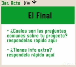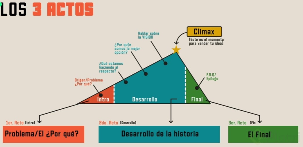 - Tercer acto: final. Emoción al máximo y momento de hacer el ask: invitar a sumarse, participar o comprar (piensa en los keynotes de Apple). Cierra con preguntas frecuentes e información extra.