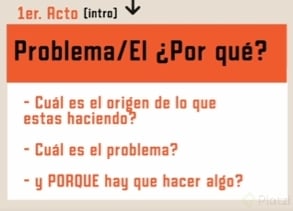 - Primer acto: problema. Presenta el porqué de todo. En cine: alguien se pierde y hay que rescatarlo (ej.: Buscando a Nemo, Rescatando al soldado Ryan). En negocios: el problema es la razón de ser del producto.